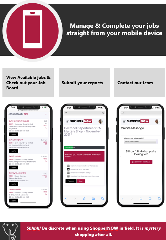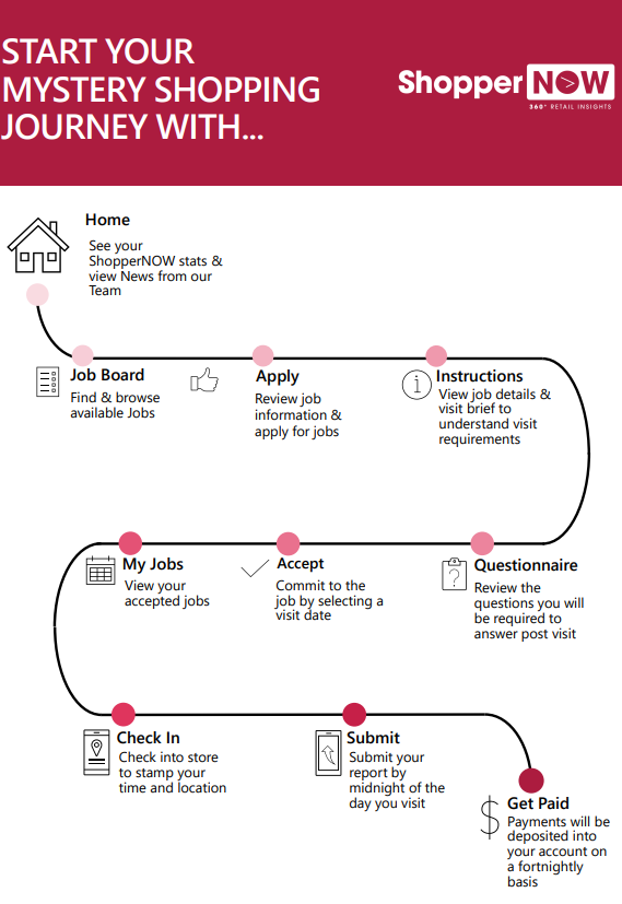 Thank you for joining our team. Before you get started please view a brief induction which will help you understand your role as a Mystery Shopper and how to view and accept jobs on ShopperNOW – Our mystery Shopper platform